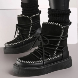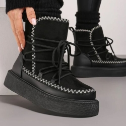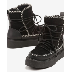 Te wyjątkowe śniegowce na platformie to esencja zimowej elegancji połączonej z nowoczesnym komfortem. Wykonane z miękkiego i przyjemnego w dotyku materiału, doskonale otulają stopy, zapewniając im ciepło nawet w najchłodniejsze dni. Charakterystyczne, kontrastowe przeszycia wokół cholewki dodają im unikalnego, modowego akcentu, który przyciąga uwagę i nadaje oryginalnego stylu.