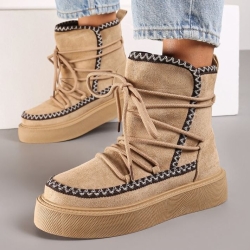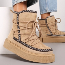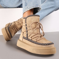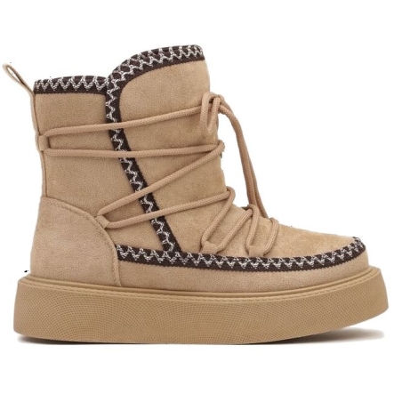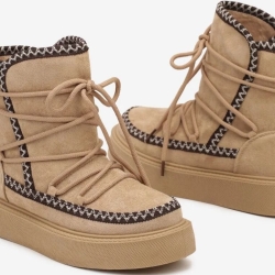 Te wyjątkowe śniegowce na platformie to esencja zimowej elegancji połączonej z nowoczesnym komfortem. Wykonane z miękkiego i przyjemnego w dotyku materiału, doskonale otulają stopy, zapewniając im ciepło nawet w najchłodniejsze dni. Charakterystyczne, kontrastowe przeszycia wokół cholewki dodają im unikalnego, modowego akcentu, który przyciąga uwagę i nadaje oryginalnego stylu.