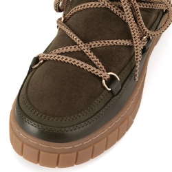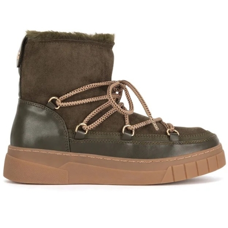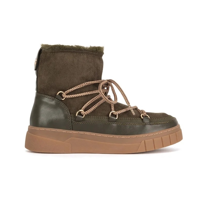 Cholewka śniegowców została wykonana z ekologicznego zamszu, który oprócz eleganckiego wyglądu charakteryzuje się wysoką trwałością. Wewnętrzna część buta została ocieplona ciepłym futerkiem, które doskonale chroni przed niskimi temperaturami i utrzymuje stopę w przyjemnym cieple. Futerko jest miękkie i przyjemne w dotyku, zapewniając wygodę podczas noszenia.