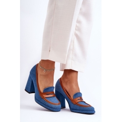 Półbuty na wysokim obcasie z grubym, słupkowym obcasem, zapewniającym solidną podstawę. Górna część buta wykonana jest z materiału dżins, co nadaje mu swobodny, a zarazem szykowny wygląd. Ten wybór tekstyliów dodaje element tekstury i wyluzowany klimat butowi.
