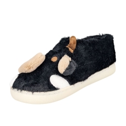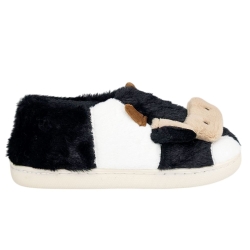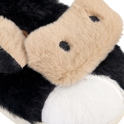 Uroczy design w kształcie krowy w łaty. Kapcie posiadają charakterystyczne elementy, takie jak uszka, małe rogi i pyszczek, co dodaje im niepowtarzalnego, zabawnego charakteru.