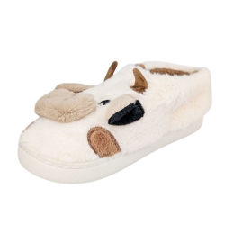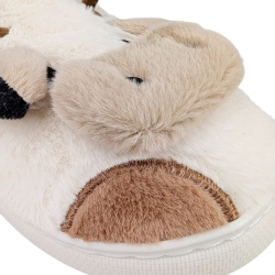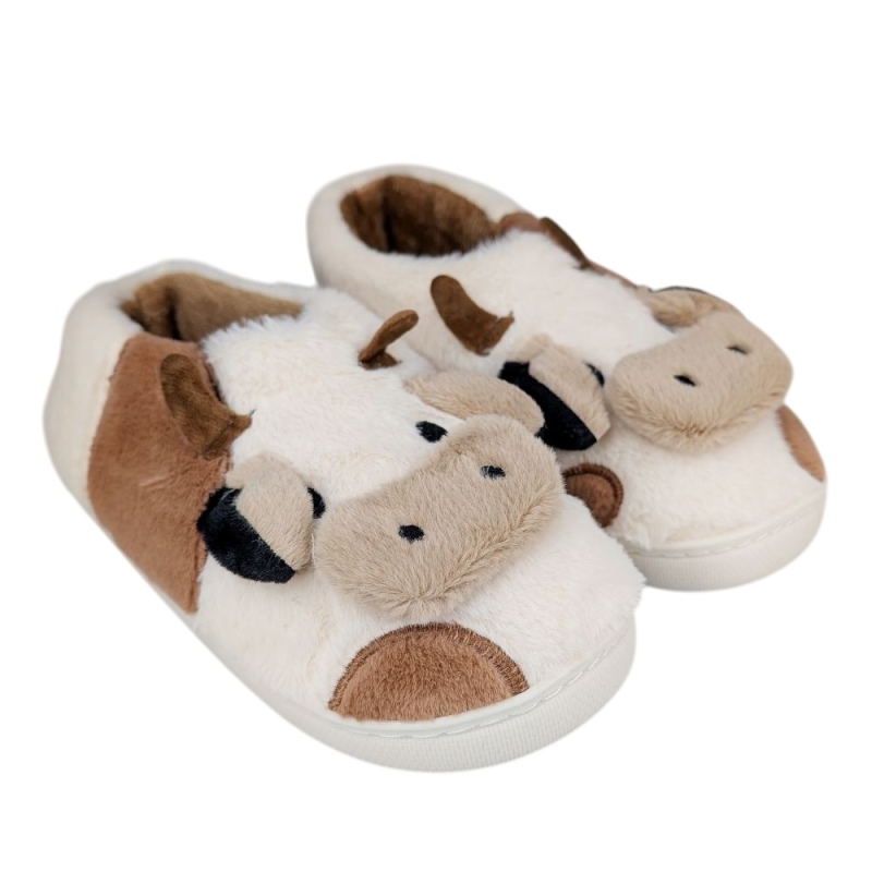 Uroczy design w kształcie krowy w łaty. Kapcie posiadają charakterystyczne elementy, takie jak uszka, małe rogi i pyszczek, co dodaje im niepowtarzalnego, zabawnego charakteru.