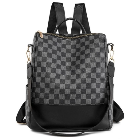 Elegancki plecak damski, który jednocześnie pełni funkcję torebki, to idealne połączenie stylu i praktyczności. Wykonany z wysokiej jakości skóry syntetycznej, charakteryzuje się trwałością oraz estetycznym wyglądem, który przyciąga uwagę. Jego klasyczny wzór szachownicy w odcieniach ciemno-szarych nadaje mu luksusowego i wyrafinowanego charakteru, doskonale pasując do każdej stylizacji.