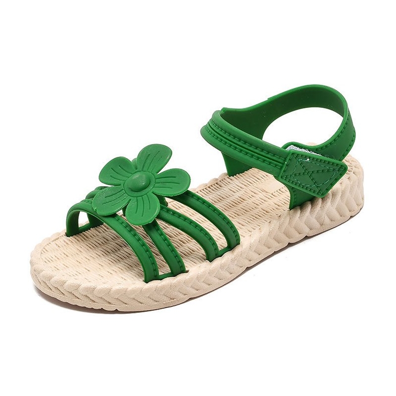 Stopy przytrzymują gumowe paski z ozdobnym kwiatkiem na przodzie. Pasek wokół kostki został wyposażony w ergonomiczny rzep.