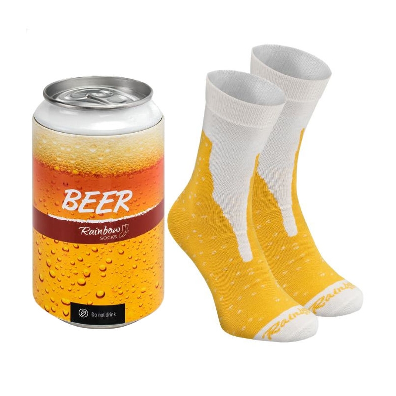 1. Wyjątkowe Skarpetki w Stylu Piwa: Przedstawiamy Skarpetki "Beer Can" od Rainbow Socks, idealne dla tych, którzy kochają orzeźwienie i złocisty kolor ulubionego piwa. Ale nie daj się zwieść! Te skarpetki wyglądają jak Twoje ulubione piwo, ale służą zupełnie innemu celowi. Pakowane w zgrabną puszkę, są gotowe zaskoczyć każdego piwosza niecodziennym designem i humorem.